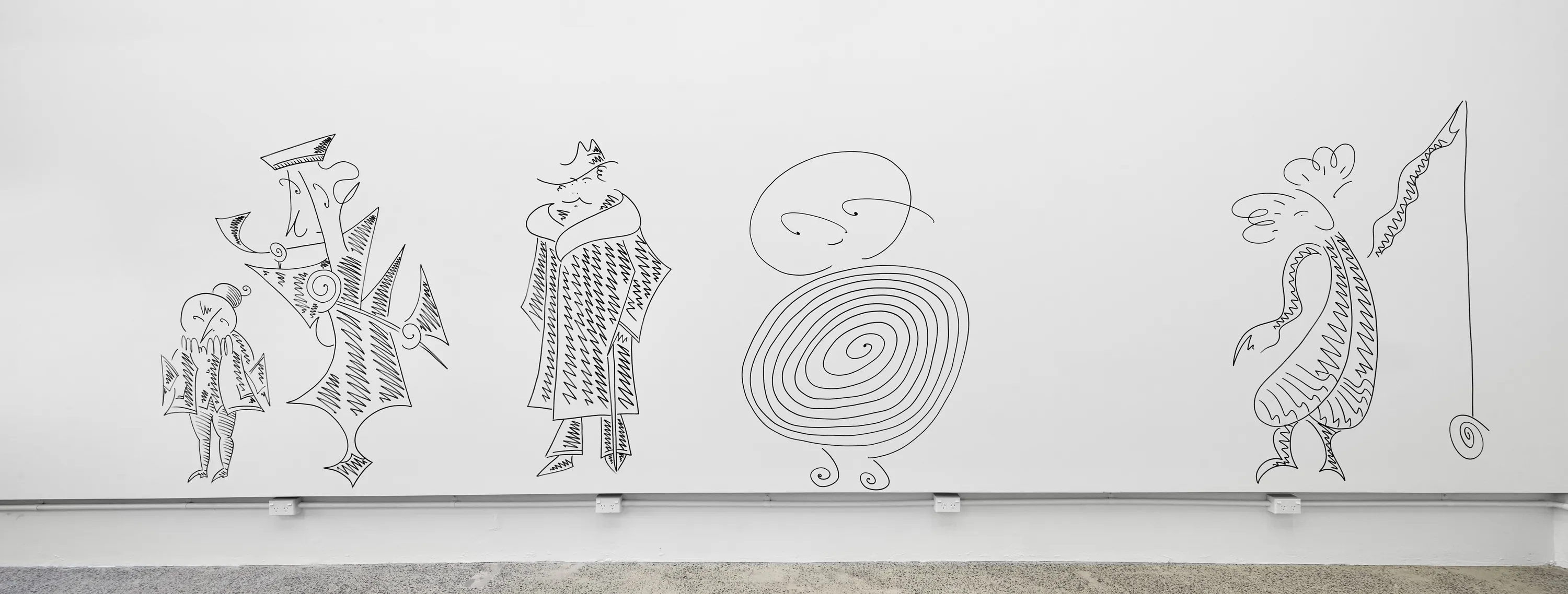 Informed by the languages of architecture, the decorative arts, interior design and theatre sets, Jack inserts furniture and small scale sculptures into the gallery space, whilst Glenn brings an audience in the form of drawings-cum-paintings on canvas and directly on the gallery wall.